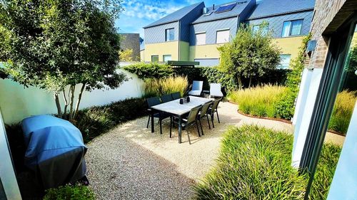 In deze unieke tuin hebben we de elegante steeneiken gebruikt om op een natuurlijke manier privacy te creëren, waardoor de inkijk van nabijgelegen ramen subtiel wordt afgeleid zonder dat dit veel onderhoud vergt. Hier geniet je van de gezelligheid van een borrel met vrienden, omringd door de groene pracht, of ontspan je samen onder de zon tussen de siergrassen, alsof je op een weide ligt en staart naar de blauwe lucht.